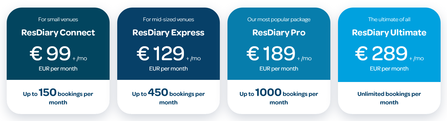 ResDiary, for instance, offers four subscription plans, ranging from 99€ to 289€ per month, with the same set of features across all plans.